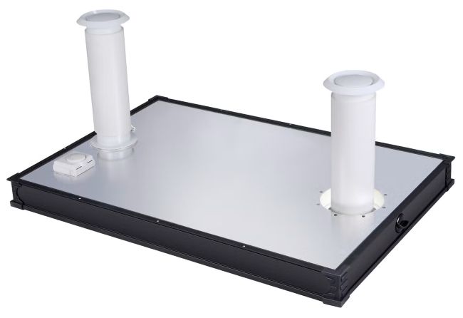 Kotelon takana alaosassa voit suorittaa valinnan - voit asentaa 100 mm tai 120 mm halkaisijaltaan olevan ilmakanavan laatikkoon. Tuuletin imee puhdasta raikaista ulkoilmaa laatikon sisälle jossa se lämpenee. Kiertämällä laatikossa olevan venttiilin auki päästät raittiin sisäilman mökin sisälle (kuvassa vaihtoehto 2).